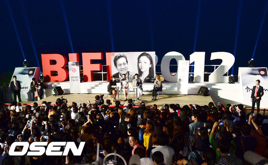 5일 오후 부산 해운대 '비프빌리지' 야외무대에서 열린 오픈토크 행사를 보기 위해 수 많은 팬들이 몰려 탕웨이와 안성기 오픈토크에 참여하고 있다.