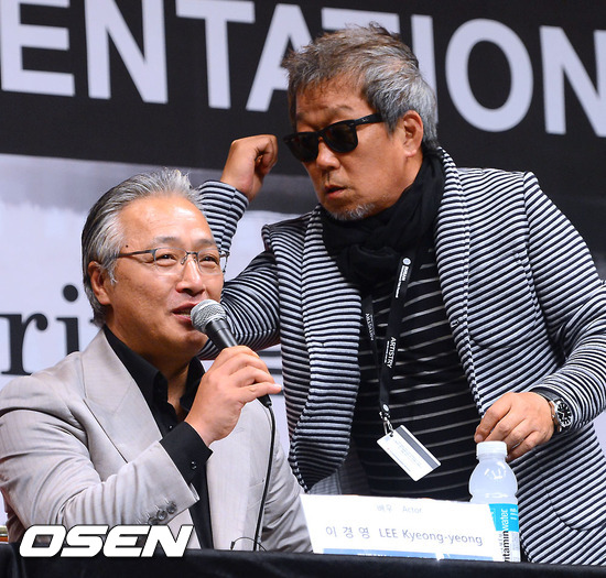 6일 오후 부산 신세계백화점 문화홀에서 진행된 영화 '남영동 1985' 갈라 프리젠테이션에서 배우 명계남이 "고문 연기가 즐거웠다"는 이경영에게 장난을 치고 있다.