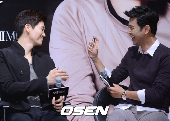 6일 오후 서면 롯데시네마에서 열린 'Meet My milestone-유지태, 남자의 완성을 말하다'행사에서 배수빈이 유지태에게 미스트를 뿌려주고 있다.
