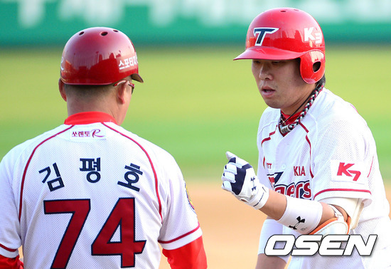 6일 오후 광주 무등야구장에서 열린 '2012 팔도 프로야구' KIA 타이거즈와 삼성 라이온즈의 경기, 1회말 무사 1,2루 KIA 안치홍이 좌전 적시타를 치고 김평호 코치와 하이파이브를 하고 있다.