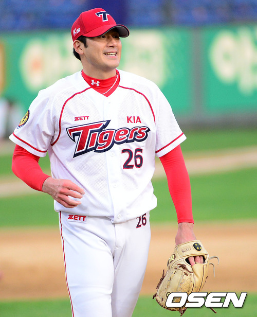 6일 오후 광주 무등야구장에서 열린 '2012 팔도 프로야구' KIA 타이거즈와 삼성 라이온즈의 경기, 3회초 2사 KIA 서재응이 삼성 이지영에게 우전안타를 허용하고 아쉬운 미소를 짓고 있다.