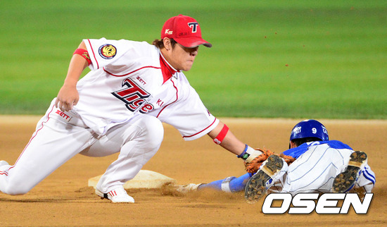 6일 오후 광주 무등야구장에서 열린 '2012 팔도 프로야구' KIA 타이거즈와 삼성 라이온즈의 경기, 6회초 무사 1루 삼성 조동찬 타석때 1루주자 강명구가 도루에 성공하고 있다.