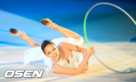 6일 오후 일산 킨텍스 신관 특설무대에서 열린 ‘LG휘센 리드믹올스타즈 2012’에서 손연재가 갈라연기를 선보일때 후프가 다리에 걸리지 않고 앞으로 빠지자 몸을 뻗어 넘어지며 잡아내고 있다.