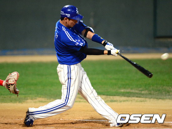 6일 오후 광주 무등야구장에서 열린 '2012 팔도 프로야구' KIA 타이거즈와 삼성 라이온즈의 경기, 6회초 2사 1,3루 삼성 손주인이 2타점 역전 적시타를 치고 있다.