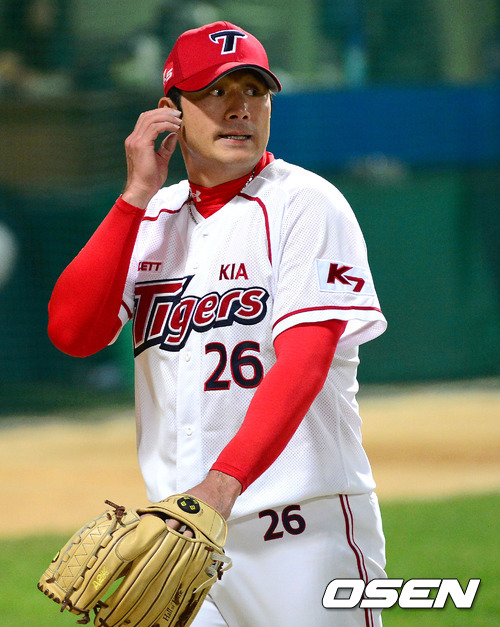 6일 오후 광주 무등야구장에서 열린 '2012 팔도 프로야구' KIA 타이거즈와 삼성 라이온즈의 경기, 6회초 수비를 마친 KIA 서재응이 아쉬운 표정으로 더그아웃으로 가고 있다. 서재응은 삼성 박한이의 동점타에 이어 손주인에게 역전타를 허용했다.