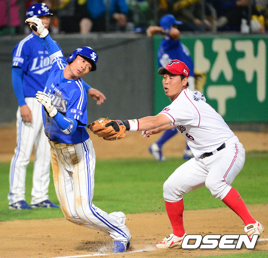 6일 오후 광주 무등야구장에서 열린 '2012 팔도 프로야구' KIA 타이거즈와 삼성 라이온즈의 경기, 6회초 1사 3루 삼성 신명철의 내야땅볼때 협살에 걸린 3루주자 강명구가 KIA 박기남에게 태그아웃으로 당하고 있다.