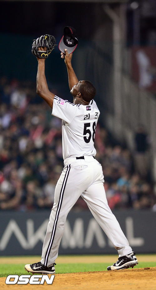 6일 오후 서울 잠실구장에서 열린 '2012 팔도 프로야구' 두산 베어스와 LG 트윈스의 경기, 8회말 1사 LG 리즈가 투수교체로 인해 강판되어 더그아웃으로 들어가면서 세레모니를 하고 있다.