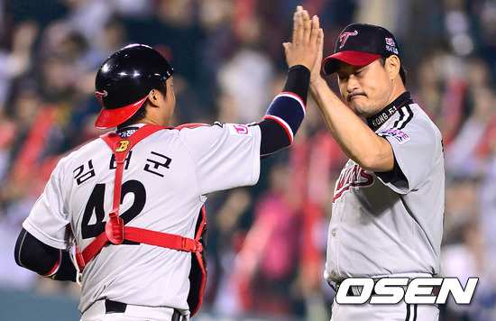 경기 종료 후 LG 봉중근과 김태군이 하이파이브를 하고 있다. / youngrae@osen.co.kr