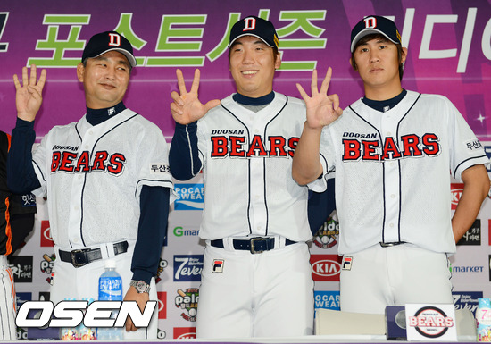 7일 오후 서울 잠실구장에서 진행된 2012 팔도프로야구 준플레이오프 미디어데이에서 두산 김진욱 감독 김현수 이용찬이 포토타임을 갖고 있다.