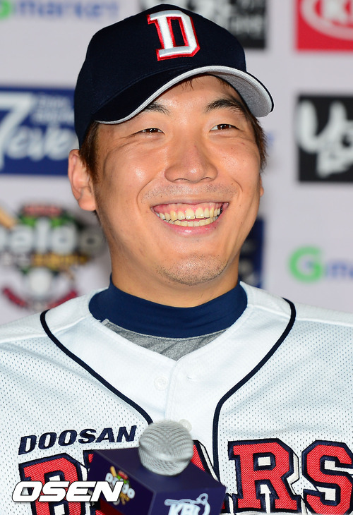 7일 오후 서울 잠실구장에서 진행된 2012 팔도프로야구 준플레이오프 미디어데이에서 두산 김현수가 각오를 밝히며 환하게 웃고 있다.