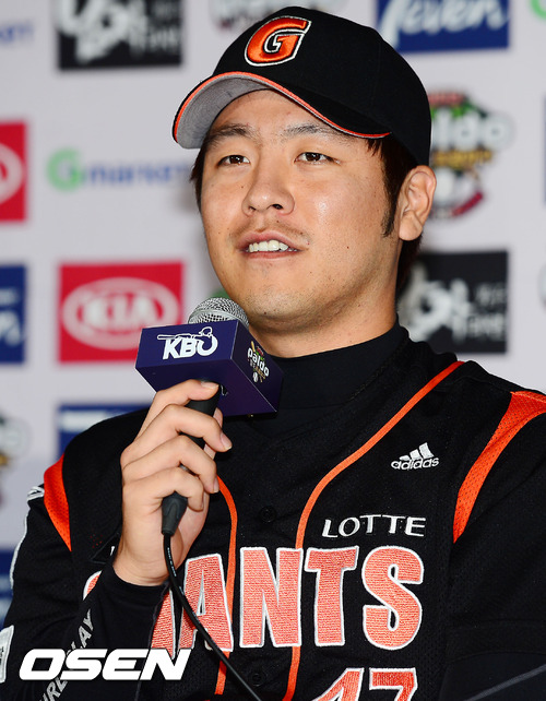 7일 오후 서울 잠실구장에서 진행된 2012 팔도프로야구 준플레이오프 미디어데이에서 롯데 강민호가 각오를 밝히고 있다.