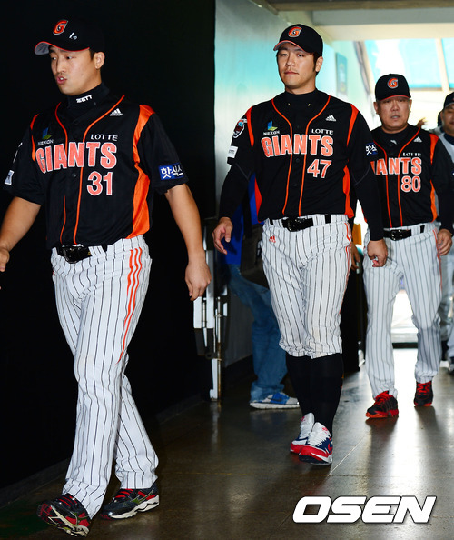 7일 오후 서울 잠실구장에서 진행된 2012 팔도프로야구 준플레이오프 미디어데이에서 롯데 손아섭 강민호 양승호 감독이 입장하고 있다.