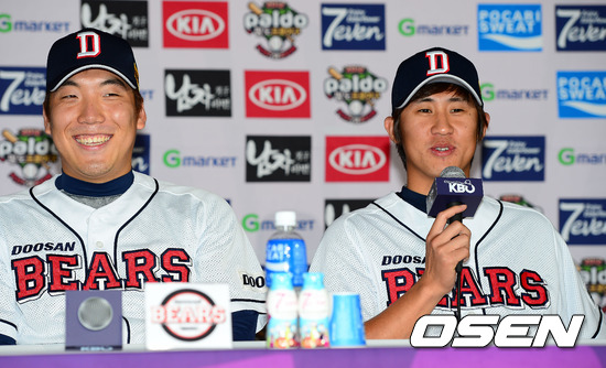 7일 오후 서울 잠실구장에서 진행된 2012 팔도프로야구 준플레이오프 미디어데이에서 두산 이용찬의 말에 김현수가 환하게 웃고 있다.