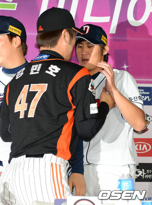 7일 오후 서울 잠실구장에서 진행된 2012 팔도프로야구 준플레이오프 미디어데이에서 롯데 강민호가 두산 이용찬에게 장난을 치고 있다.