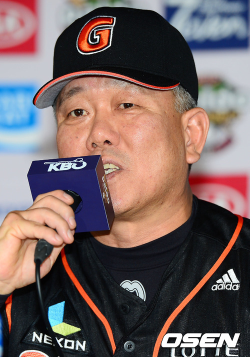 7일 오후 서울 잠실구장에서 진행된 2012 팔도프로야구 준플레이오프 미디어데이에서 롯데 양승호 감독이 출사표를 던지고 있다.