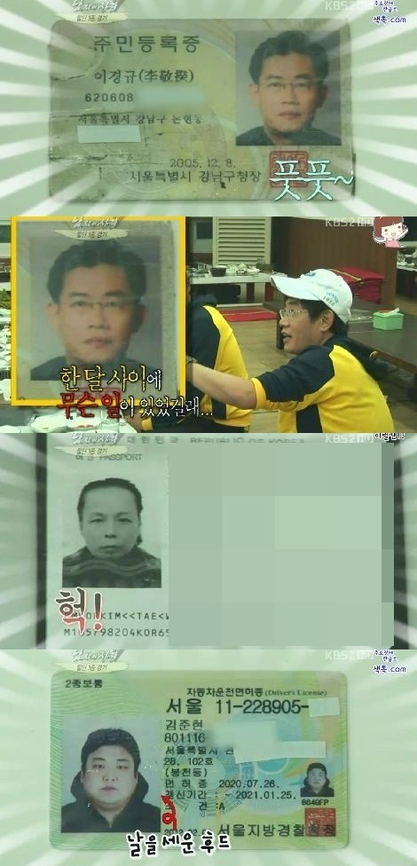 공개된 이경규의 주민등록증에는 수십년 전의 이경규의 모습이 다소 놀라움을 안겼다. 풋풋한 이경규의 모습에 멤버들은 놀라움을 보였고 이에 이경규는 "어제 찍은 사진이다"라고 농담을 던지기도 했다.