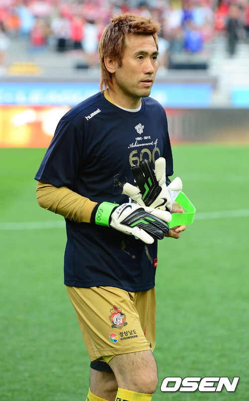 7일 오후 서울월드컵경기장에서 열린 '현대오일뱅크 K리그 2012' 35라운드 FC 서울과 경남 FC의 경기에 앞서 경남 김병지가 경기를 준비하고 있다. 경남의 골키퍼 '살아있는 전설' 김병지(42)는 이날 경기에 출장하며 K리그 통산 최초 600경기 출장이라는 대기록을 세웠다. 김병지는 '최초 골키퍼 득점', '최초 200경기 무실점', '통산 최다 연속 무교체 출장' 등을 연속해서 세우며 전설의 반열에 이름을 올리고 있다.