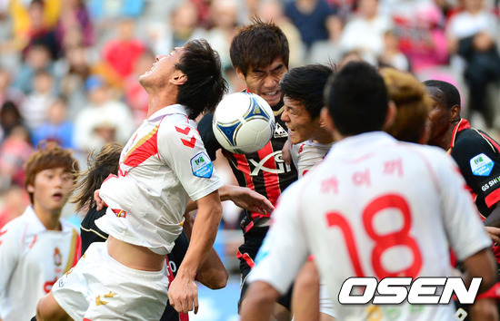 7일 오후 서울월드컵경기장에서 열린 '현대오일뱅크 K리그 2012' 35라운드 FC 서울과 경남 FC의 경기, 전반 서울의 코너킥때 양팀 선수들이 공중볼 다툼을 하고 있다.
