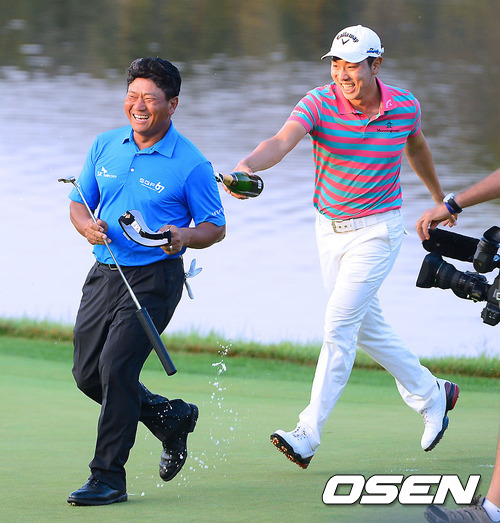 경기 후 우승을 차지한 최경주가 후배 배상문에게 샴페인 세례를 받고 있다 . / soul1014@osen.co.kr
