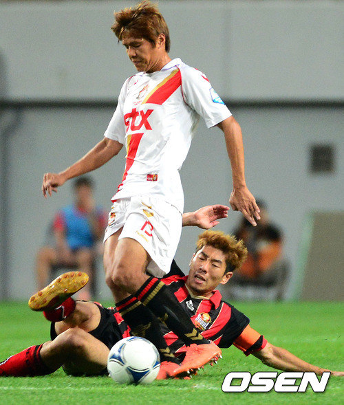 7일 오후 서울월드컵경기장에서 열린 '현대오일뱅크 K리그 2012' 35라운드 FC 서울과 경남 FC의 경기, 후반 서울 하대성이 경남 최현연에게 태클을 하고 있다.