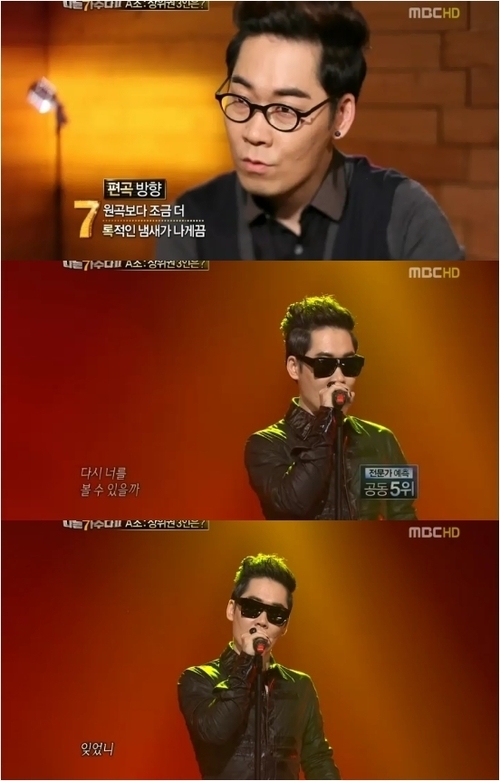 하위권으로 갈 가능성이 높은 첫 번째 순서였지만 김연우는 가죽재킷에 선글라스를 끼고 파격적인 변신으로 시선을 우선 끌었다.