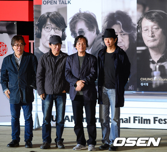 7일 오후 부산 해운대 비프빌리지 야외무대에서 열린 오픈토크 행사에 참석한 정지영 김성홍 박철수 전수일 감독이 기념촬영을 하고 있다.