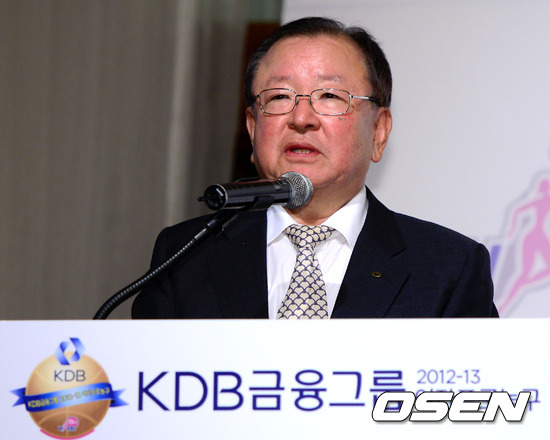 8일 오전 서울 플라자호텔에서 진행된 'KDB 금융그룹 2012-13 여자프로농구' 미디어데이 및 타이틀 스폰서 조인식에서 KDB 금융그룹 강만수 회장이 인사말을 전하고 있다.