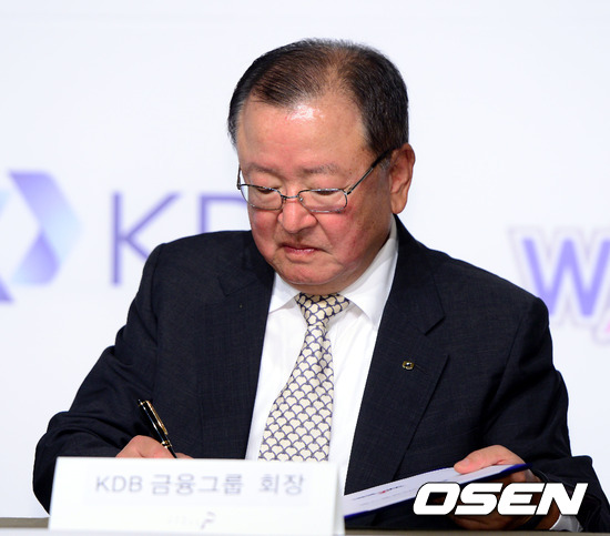 8일 오전 서울 플라자호텔에서 진행된 'KDB 금융그룹 2012-13 여자프로농구' 미디어데이 및 타이틀 스폰서 조인식에서 KDB 금융그룹 강만수 회장이 조인서에 사인을 하고 있다.