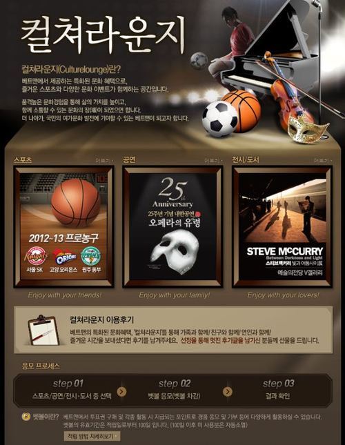 국민체육진흥공단(www.kspo.or.kr)이 발행하는 체육진흥투표권 수탁사업자인 스포츠토토의 공식 온라인 발매 사이트 베트맨(www.betman.co.kr)이 진행하고 있는 베트맨 컬쳐라운지 스포츠, 공연 및 전시·도서 이벤트가 스포츠토토팬들의 뜨거운 관심 속에 성황리에 진행되고 있다.