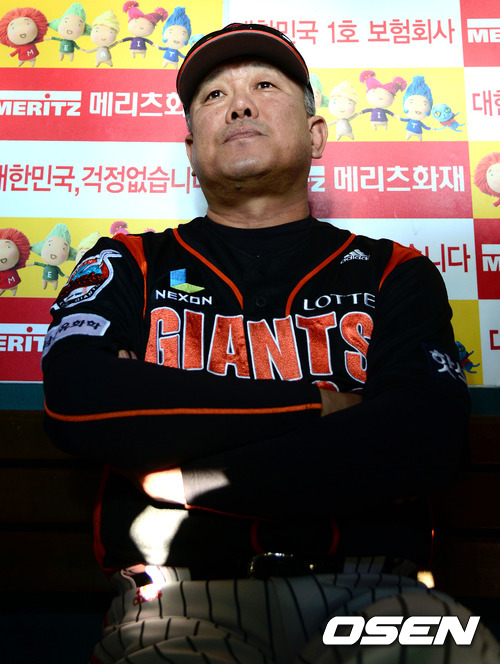 8일 오후 서울 잠실야구장에서 열린 2012 팔도프로야구 준PO1차전 두산 베어스와 롯데 자이언츠의 경기에 앞서 롯데 양승호 감독이 취재진과 이야기를 나누고 있다.