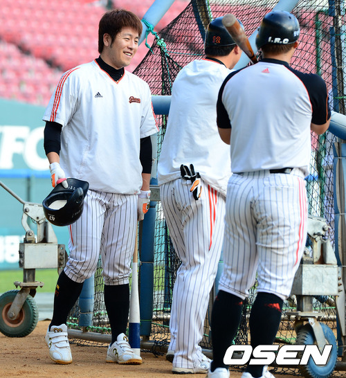 8일 오후 서울 잠실야구장에서 열린 2012 팔도프로야구 준PO1차전 두산 베어스와 롯데 자이언츠의 경기에 앞서 롯데 강민호가 동료 선수들과 이야기를 나누고 있다.