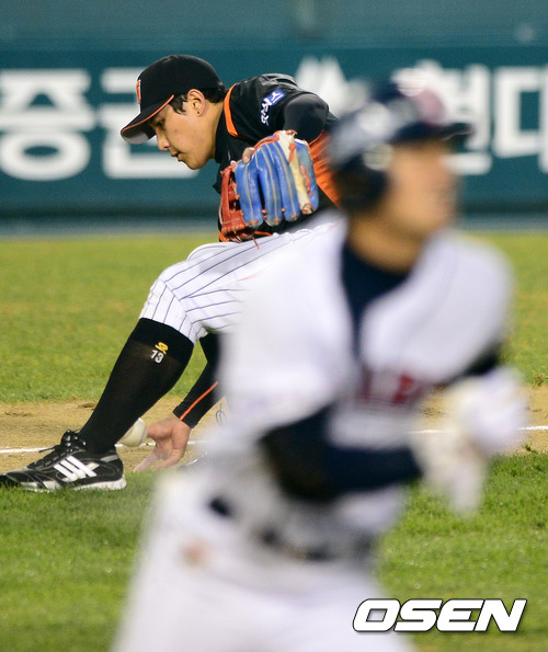 8일 오후 서울 잠실구장에서 열린 2012 팔도 프로야구 준플레이오프 1차전 두산 베어스(3위)와 롯데 자이언츠(4위)의 경기, 1회말 무사 1루에서 롯데 황재균이 두산 오재원의 보내기 번트 타구를 놓치고 있다.
