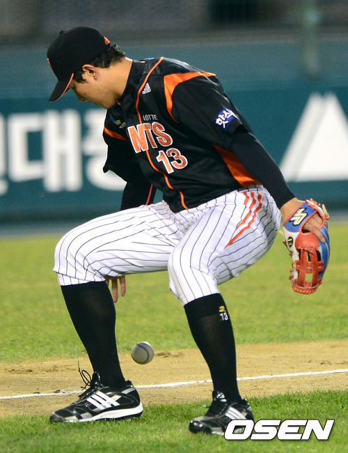 8일 오후 서울 잠실구장에서 열린 2012 팔도 프로야구 준플레이오프 1차전 두산 베어스(3위)와 롯데 자이언츠(4위)의 경기, 1회말 무사 1루에서 롯데 황재균이 두산 오재원의 보내기 번트 타구를 놓치고 있다.
