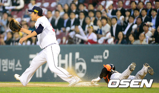 8일 오후 서울 잠실구장에서 열린 2012 팔도 프로야구 준플레이오프 1차전 두산 베어스(3위)와 롯데 자이언츠(4위)의 경기, 1회초 1사 롯데 김주찬이 내야안타를 치고 헤드퍼스트 슬라이딩을 하고 있다.