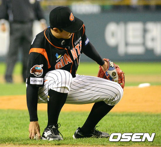 8일 오후 서울 잠실구장에서 열린 2012 팔도 프로야구 준플레이오프 1차전 두산 베어스(3위)와 롯데 자이언츠(4위)의 경기, 1회말 무사 1루에서 롯데 황재균이 두산 오재원의 보내기 번트 타구를 놓치고 있다.