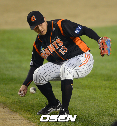 8일 오후 서울 잠실구장에서 열린 2012 팔도 프로야구 준플레이오프 1차전 두산 베어스(3위)와 롯데 자이언츠(4위)의 경기, 1회말 무사 1루에서 롯데 황재균이 두산 오재원의 보내기 번트 타구를 놓치고 있다.
