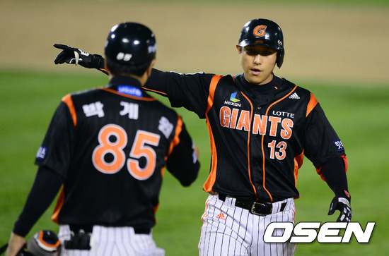 8일 오후 서울 잠실구장에서 열린 2012 팔도 프로야구 준플레이오프 1차전 두산 베어스(3위)와 롯데 자이언츠(4위)의 경기, 4회초 2사 1,3루에서 롯데 황재균이 선제 1타점 적시타를 날리고 기뻐하고 있다.