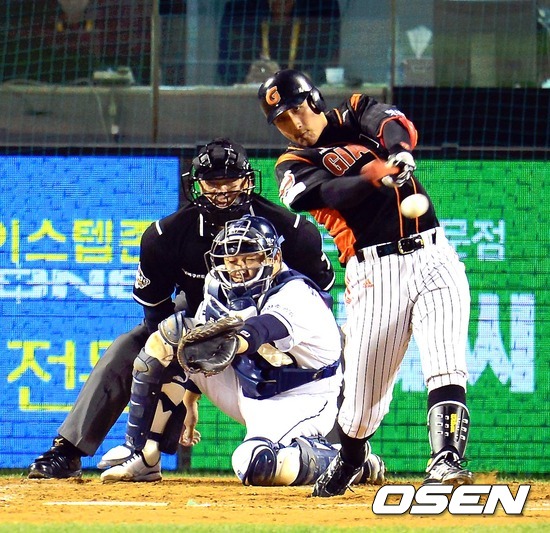 8일 오후 서울 잠실야구장에서 열린 2012 팔도프로야구 준PO1차전 두산 베어스와 롯데 자이언츠의 경기 4회초 2사 1,3루 황재균이 적시타를 치고 있다.