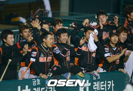 4회초 3득점을 올린 롯데 자이언츠 선수들이 환호하고 있다.