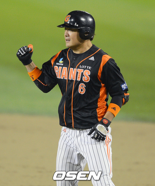 4회초 2사 1,2루 문규현 적시타를 날리고 1루에서 환호하고 있다.