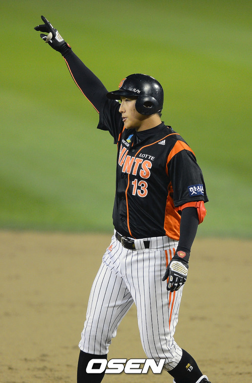 4회초 2사 1,3루 황재균 선취타점을 올리며 환호하고 있다.