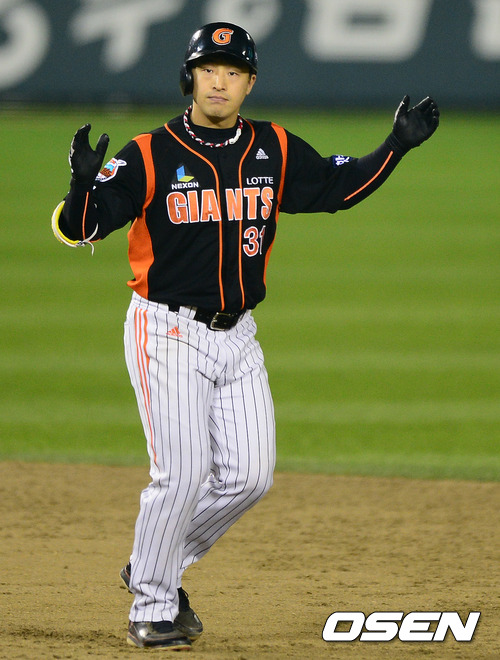 8일 오후 서울 잠실구장에서 열린 2012 팔도 프로야구 준플레이오프 1차전 두산 베어스(3위)와 롯데 자이언츠(4위)의 경기, 4회초 2사 1,3루에서 롯데 손아섭이 1타점 적시 2루타를 날리고 기뻐하고 있다.