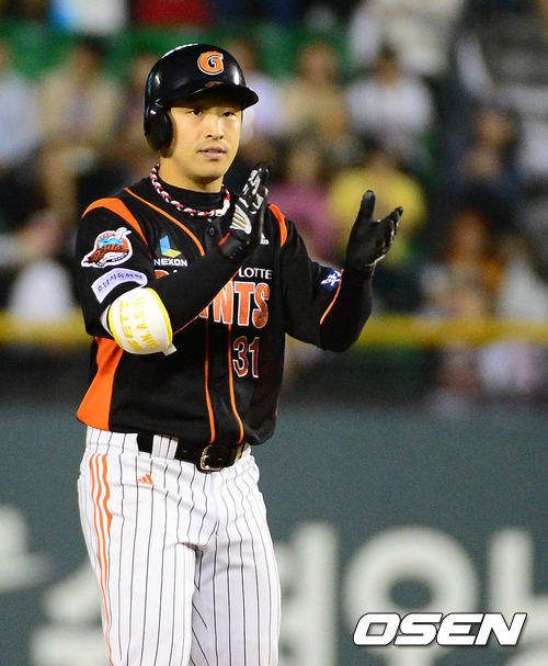 8일 오후 서울 잠실구장에서 열린 2012 팔도 프로야구 준플레이오프 1차전 두산 베어스(3위)와 롯데 자이언츠(4위)의 경기, 4회초 2사 1,3루에서 롯데 손아섭이 우전 적시타를 치고 환호하고 있다.