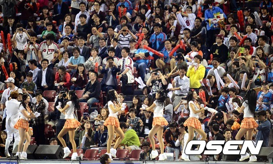 8일 오후 서울 잠실야구장에서 열린 2012 팔도프로야구 준PO1차전 두산 베어스와 롯데 자이언츠의 경기 롯데 치어리더들이 강남스타일에 맞춰 신나게 춤을 추고 있다.