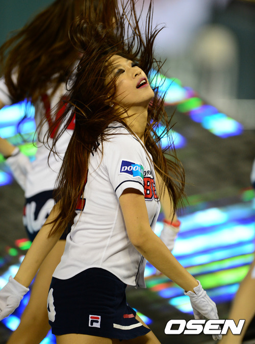 8일 오후 서울 잠실구장에서 열린 2012 팔도 프로야구 준플레이오프 1차전 두산 베어스(3위)와 롯데 자이언츠(4위)의 경기, 두산 치어리더가 열띤 응원을 선보이고 있다.