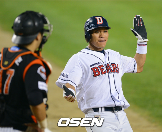5회말 2사 1,2루 롯데 송승준 투수의 1루견제구 악송구때 2루 주자 이종욱 홈에서 동점 득점을 올리며 환호하고 있다.