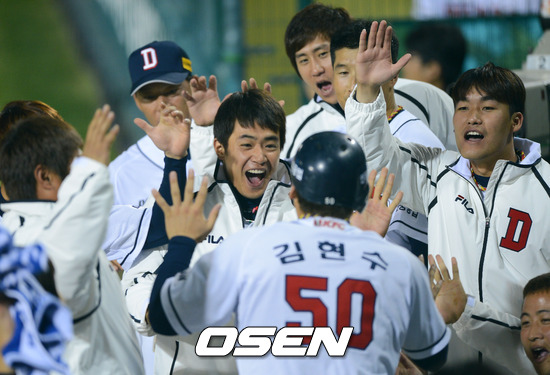 5회말 2사 3루 윤석민 역전 적시타때 3루 주자 김현수 득점을 올리며 덕아웃 동료들의 환영을 받고 있다.