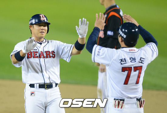 5회말 2사 3루 윤석민 역전 적시타를 날리고 전형도 코치의 환영을 받고 있다.