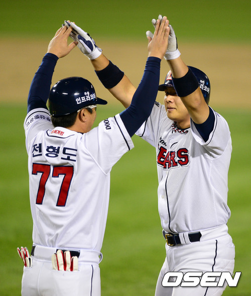 8일 오후 서울 잠실구장에서 열린 2012 팔도 프로야구 준플레이오프 1차전 두산 베어스(3위)와 롯데 자이언츠(4위)의 경기, 5회말 2사 3루에서 두산 윤석민이 역전 1타점 적시타를 날리고 전형도 코치와 기뻐하고 있다.