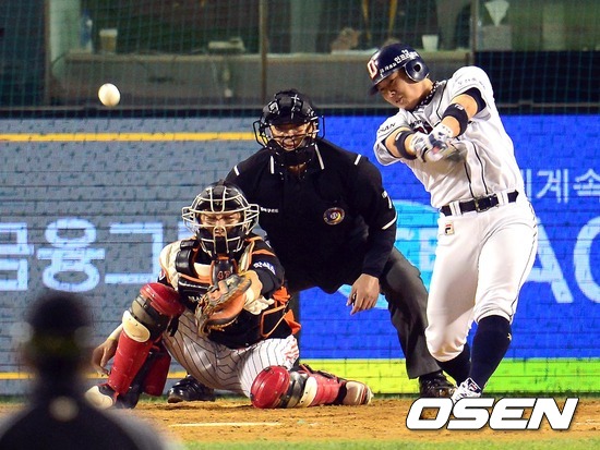8일 오후 서울 잠실야구장에서 열린 2012 팔도프로야구 준PO1차전 두산 베어스와 롯데 자이언츠의 경기 5회말 2사 3루 윤석민이 역전 적시타를 치고 있다.